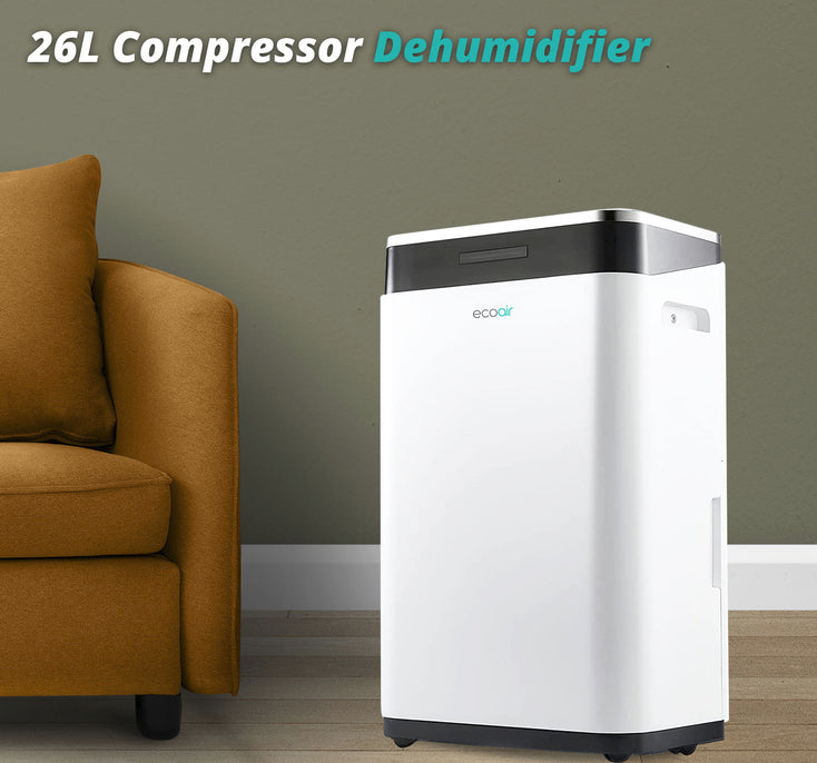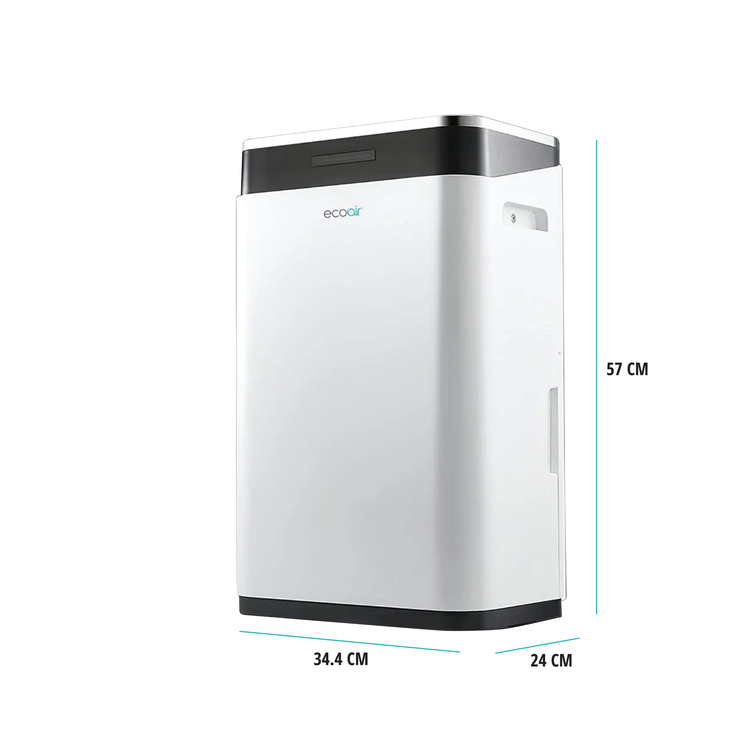 Luchtontvochtiger EcoAir DC26 met ontvochtiging tot 26 liter water per dag, is een klasse apart op het gebied van prestaties, instelmogelijkheden en bediening. Zijn mooie luchtvochtigheidsindicator kleurt blauw bij een lage waarde (< 45% RV), groen bij een goede vochtigheidsgraad (45 - 65% RV), en rood bij een hoge waarde (> 65% RV) EcoAir DC26 is uitgerust met een digitaal hygrometerdisplay, een koolstoffilter voor het verwijderen van nare geurtjes, en een grote watertank van 6,5 liter. Het water rechtstreeks met een afvoerleiding afvoeren kan ook, koppel eenvoudig de meegeleverde afvoerslang aan.