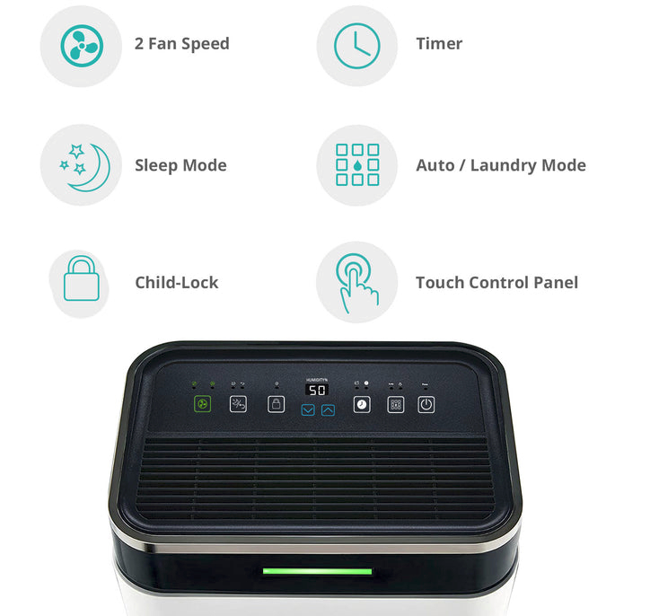 Perfecte droogresultaten met EcoAir DC-ontvochtigers Mooi vormgegeven en voorzien van talrijke functies, EcoAir DC-ontvochtigers vertegenwoordigen klasse en prestaties. De nauwkeurige LED-regeling is overzichtelijk, beheer eenvoudig het vochtigheidsniveau in huis of op de werkplek. Zijn intelligente monitoring en aansturing waarborgt perfecte droogresultaten. Stijlvol bedieningspaneel met uitgebreide functies Het touch-bedieningspaneel van EcoAir DC26 is duidelijk. Alle functies zijn snel toegankelijk en het display toont de luchtvochtigheid in de kamer. Diverse functies onderstrepen het gebruiksgemak. Stel de digitale hygrostaat in op de gewenste luchtvochtigheid, gebruik zijn timer voor het instellen van de AAN en UIT tijd, of schakel de slaapstand in voor de onopvallende werking tijdens de nacht. Zijn kinderslotfunctie vergendelt de toetsen zodat instellingen niet zonder toezicht gewijzigd worden. EcoAir DC26 biedt de flexibiliteit van twee ventilatorsnelheden en daarom de mogelijkheid om energie en geluid te verminderen in de lage stand. 3-kleuren luchtvochtigheidsindicator EcoAir DC26 laat aan zijn voorzijde duidelijk zien hoe hoog de luchtvochtigheid in de kamer is. Blauw – geeft een lage omgevingsvochtigheid van 45% of minder aan, Groen – geeft een comfortabele omgevingsvochtigheid van 45% tot 65% aan en Rood – geeft een hoge vochtigheid van meer dan 65% aan. De indicator laat zien hoe snel de ontvochtiger droogt tot gezonde omstandigheden bereikt zijn. Blijft de indicator rood? Stel dan de ontvochtiger in op een lagere luchtvochtigheid. Streef naar een gezonde vochtigheidsgraad van 45% tot 65%. Automatische functies De DC26 geeft 'Tank vol' aan en schakelt uit wanneer de opvangtank vol is. Deze unit heeft ook een automatische herstart, wat handig is als er een onderbreking is in de stroomvoorziening. De functie schakelt een automatische herstart in wanneer de stroomvoorziening is hersteld, waarbij de vorige instelling wordt onthouden. Wanneer de watertank vol is of wordt verwijderd, worden de bedieningselementen uitgeschakeld. Kenmerken van luchtontvochtiger EcoAir DC26 Maximale extractiesnelheid: 26 liter/dag Watertankcapaciteit van 6.5 liter Continue afvoeroptie, slang is inbegrepen Gebruiksvriendelijk touch-bedieningspaneel Hygrostaat Snelle regeling van vochtigheid en drogen van wasgoed binnenshuis Automatisch ontdooien Regelt schimmel-, condens- en bacteriegroei 'Easy Glide'-zwenkwielen Wasbaar koolstoffilter