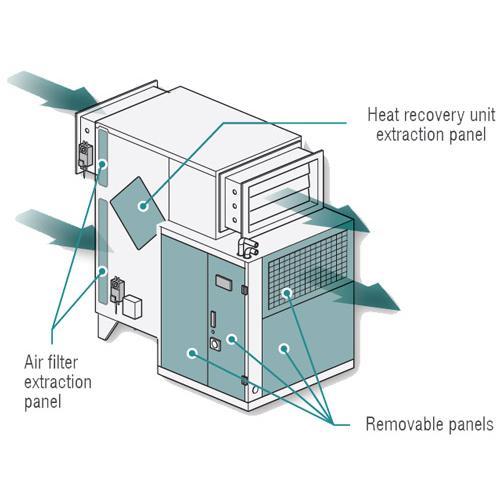 De dwarsstroom warmteterugwinunit maakt het mogelijk warmte terug te winnen uit de uitgaande luchtstroom, de warmte wordt afgegeven aan de inkomende luchtstroom. De warmteterugwinunit met aluminium onderdelen en voorgecoate vinnen is ontworpen voor gebruik in zwembadruimtes.